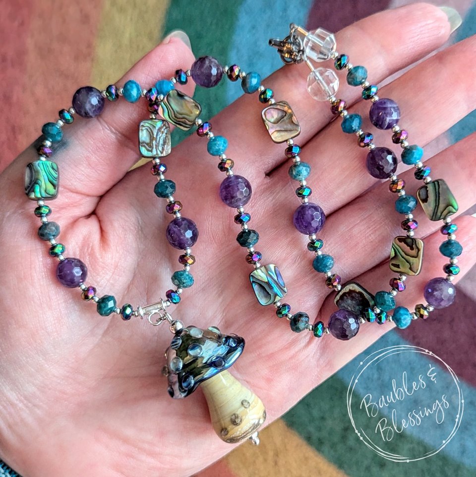 This one of a kind necklace combines amethyst, pāua shell, blue apatite, and electroplated hemalyke beads with sterling silver spacers. The iridescent lampwork glass mushie pendant was handmade by Esmerical Glassworks.