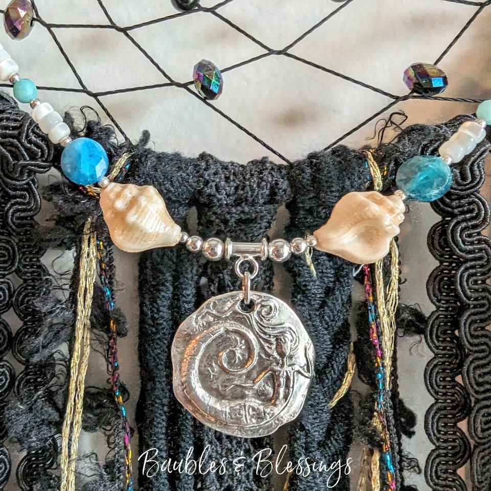 This gorgeous necklace combines mother of pearl beads with amazonite, apatite, citrine, and sterling silver spacers. The pendant is a sterling silver medallion with an embossed mermaid.