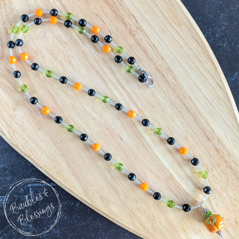 This fun necklace features faceted onyx and Czech glass beads, seed bead spacers, a lampwork pumpkin handmade by Esmerical Glassworks, and sterling silver accents. Choose your length!