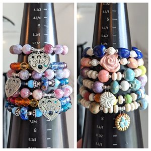 All of my stretchy bracelets are strung on pre-stretched, latex-free clear cord. I tie these bracelets with a surgeon's knot, plus an extra knot on top. I then use jewelry adhesive to secure the knot, allow it to cure, and cover with a hypoallergenic stainless steel crimp cover.